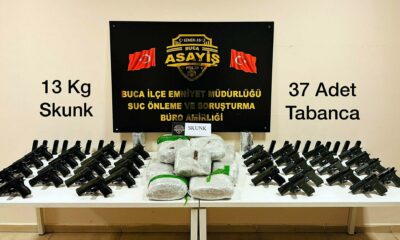 İZMİR’in Buca ilçesinde, polisin düzenlediği operasyonda ruhsatsız 37 tabanca ve 13 kilo uyuşturucu madde skunk ele geçirilirken, 2 kişi gözaltına alındı. Buca ilçe Emniyet Müdürlüğü ekipleri, silah...