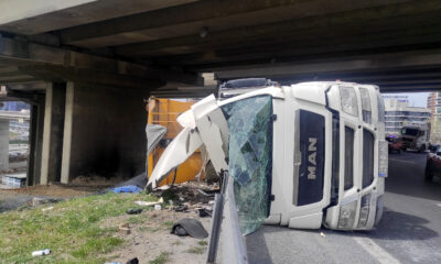 KAĞITHANE TEM Bağlantı yolunda virajı alamayan kum yüklü hafriyat kamyonu bariyerleri parçalayarak yan yattı. Kazada yaralanan şoför, sağlık ekipleri tarafından hastaneye kaldırıldı. Kaza, TEM Otoyolu Seyrantepe...