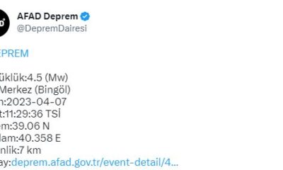 BİNGÖL’de Richter ölçeğine göre 4.5 büyüklüğünden deprem meydana geldi. Depremde ilk belirlemelere göre herhangi bir olumsuzluk yaşanmadı. Afet ve Acil Durum Yönetimi Başkanlığı’nın (AFAD) merkez üssünü...