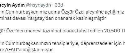 CUMHURBAŞKANI Recep Tayyip Erdoğan’ın avukatı Hüseyin Aydın, CHP Grup Başkan Vekili Özgür Özel’e açtıkları manevi tazminat davasının Yargıtay’da onandığını, Özel’den tahsil edilen 20 bin 500 TL’nin...