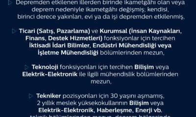Türk Telekom’un kariyer sitesinde, deprem felaketinden etkilenen 11 ilde, istihdamda öncelik çalışmasının başlatıldığı duyuruldu. Şirketin kariyer sayfasındaki ilanda; depremden etkilenen illerden birinde ikametgahı olan adaylar için...