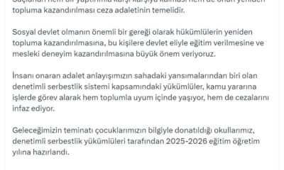 Bakan Yılmaz Tunç, sosyal medya hesabından yaptığı açıklamada, “Ceza adaletinin en önemli amacı, toplumu suçtan ve suçludan korumak, suç işlenmesini önlemektir. Suçlunun hem bir yaptırımla karşı...