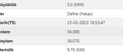 HATAY’ın Defne ilçesinde, Richter ölçeğine göre 5 büyüklüğünde deprem meydana geldi. Afet ve Acil Durum (AFAD) Yönetimi Başkanlığı verilerine göre; saat 18.53’te merkez üssü Hatay’ın Defne ilçesinde...