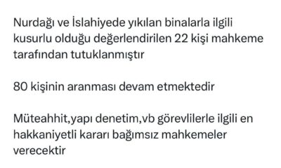 GAZİANTEP Valisi Davut Gül, Kahramanmaraş merkezi depremlerin vurduğu Gaziantep’in İslahiye ve Nurdağı ilçelerinde yıkılan binalara ilişkin yürütülen soruşturmada 22 kişinin tutuklandığını açıkladı. Gaziantep Valisi Davut Gül,...