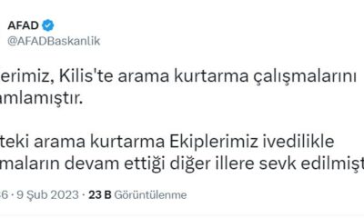 AFET ve Acil Durum Yönetimi Başkanlığı (AFAD), Kilis’te yürütülen arama-kurtarma çalışmalarının tamamlandığını, oradaki ekiplerin diğer illere sevk edildiğini duyurdu. AFAD’ın Twitter’daki hesabından yapılan açıklamada, “Ekiplerimiz, Kilis’te arama...