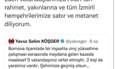 ÖLÜ SAYISI 6’YA YÜKSELDİ İzmir Valisi Yavuz Selim Köşger, Bornova ilçesinde bir inşaatta meydana gelen kazada ölü sayısının 6’ya yükseldiğini duyurdu. Vali Köşger, sosyal medyadan yaptığı...