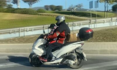 KARTAL D-100 karayolunda bir motosiklet sürücüsü, çocuğuna kask takmadan yolculuk yaptı. Trafikteki diğer sürücülerin cep telefonu kamerasıyla görüntülediği sürücünün, kendisinde kask olduğu ama çocuğuna şapka taktığı...