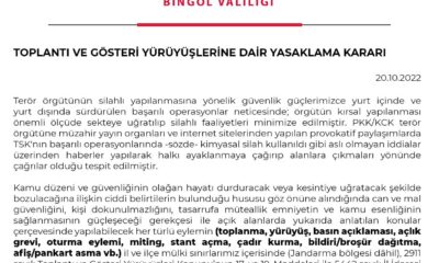 BİNGÖL Valiliği, kent genelinde bugünden geçerli olmak üzere 15 gün süreyle toplanma, yürüyüş ve basın açıklaması gibi eylem yasağı getirildiğini bildirdi. Bingöl Valiliği’nce kentte bugünden geçerli...