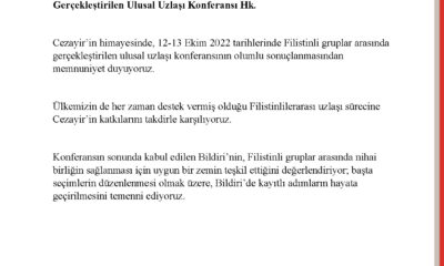 DIŞİŞLERİ Bakanlığı’ndan, Cezayir’de Gerçekleştirilen Ulusal Uzlaşı Konferansı’na ilişkin yapılan açıklamada, “Filistinliler arası uzlaşı sürecine Cezayir’in katkılarını takdirle karşılıyoruz” denildi. Dışişleri Bakanlığı, Filistinli gruplar arasında gerçekleştirilen Ulusal...