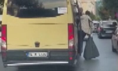 GÜNGÖREN’de iki yolcu minibüsün kapısından sarkarak yolculuk yaptı. Yolculardan birinin elinde taşığı büyük poşetin zaman zaman yolda süründüğü gözlendi. O anlar trafikteki bir başka yolcu tarafından...