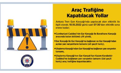 ANKARA Emniyet Müdürlüğü, Ankara Tren Garı Kavşağı’nda yapılacak olan etkinlik dolayısıyla bazı yolların 09.00-10.30 saatleri arasında trafiğe kapatılacağını duyurdu. Ankara Emniyet Müdürlüğü, 10 Ekim Pazartesi günü Ankara...