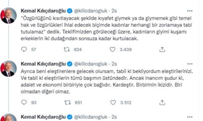 CHP Genel Başkanı Kemal Kılıçdaroğlu, başörtüsü kanun teklifiyle ilgili, “İktidarımızın ilk haftasında hem İstanbul Sözleşmesi’ni hem de bu önerdiğimiz kanunu Anayasa’ya da geçireceğim” dedi. CHP Genel...