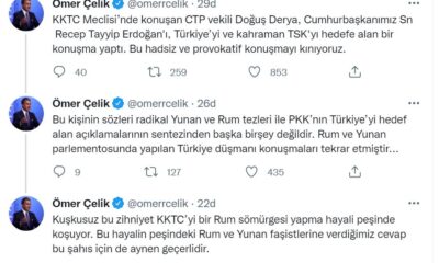 AK Parti Genel Başkan Yardımcısı ve Parti Sözcüsü Ömer Çelik, Kuzey Kıbrıs Türk Cumhuriyeti (KKTC) Cumhuriyet Meclisi’nde konuşan Cumhuriyetçi Türk Partisi (CTP) Milletvekili Doğuş Derya’nın, Türkiye’ye...