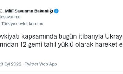 MİLLİ Savunma Bakanlığı (MSB), bugün itibarıyla Ukrayna limanlarından tahıl yüklü 12 geminin hareket ettiğini duyurdu. Bakanlığın Twitter hesabından yapılan açıklamada, “Tahıl sevkiyatı kapsamında bugün itibarıyla Ukrayna...