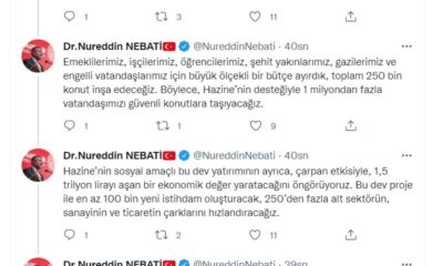 HAZİNE ve Maliye Bakanı Nureddin Nebati, sosyal konut projesine ilişkin, “Toplam 250 bin konut inşa edeceğiz. Böylece, Hazine’nin desteğiyle 1 milyondan fazla vatandaşımızı güvenli konutlara taşıyacağız”...