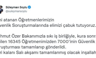 İÇİŞLERİ Bakanı Süleyman Soylu, “16 bin 345 öğretmenimizden 7 bininin güvenlik soruşturması tamamlanıp gönderildi. Geri kalanı salı akşamı tamamlanmış olacak” dedi. Bakan Soylu, yeni atanan öğretmenlerin...