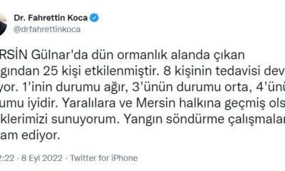 SAĞLIK Bakanı Fahrettin Koca, Mersin Gülnar’da çıkan orman yangınından 25 kişinin etkilendiğini, tedavisi devam eden 8 kişiden 1’inin hayati tehlikesinin olduğunu açıkladı. Sağlık Bakanı Koca, Twitter’daki hesabından yaptığı...