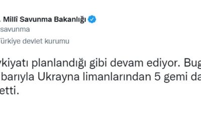 MİLLİ Savunma Bakanlığı, bugün itibarıyla tahıl yüklü 5 geminin daha Ukrayna limanlarından hareket ettiğini duyurdu. Bakanlığın Twitter’daki hesabından yapılan açıklamada, “Tahıl sevkiyatı planlandığı gibi devam ediyor....
