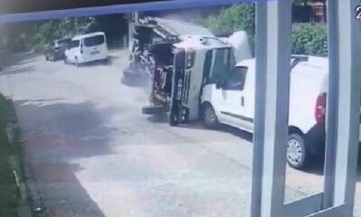 SARIYER’de yokuş aşağı inen su yüklü kamyonetin devrildiği anlar güvenlik kamerasına yansıdı. Cumhuriyet Mahallesi Kefeliköy Bayırı Caddesi’nde saat 14.30 sıralarında Hürol Akdağ’ın kullandığı su yüklü 06...