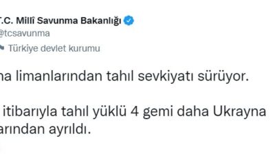 MİLLİ Savunma Bakanlığı (MSB), bugün itibarıyla tahıl yüklü 4 geminin daha Ukrayna limanlarından ayrıldığını duyurdu. Bakanlığın Twitter hesabından yapılan açıklamada, “Ukrayna limanlarından tahıl sevkiyatı sürüyor. Bugün...