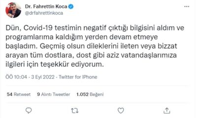 SAĞLIK Bakanı Fahrettin Koca, Covid-19 testinin negatife döndüğünü, programlarına kaldığı yerden devam etmeye başladığını duyurdu. Sağlık Bakanı Koca, koronavirüsü atlattığını, Twitter’dan yaptığı açıklama ile duyurdu. Bakan Koca,...