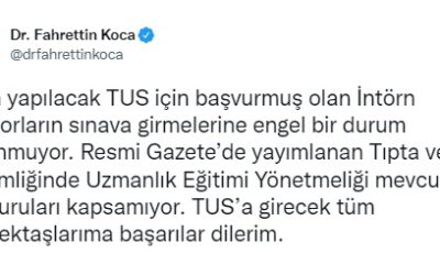 SAĞLIK Bakanı Fahrettin Koca, “Yarın yapılacak TUS için başvurmuş olan İntörn Doktorların sınava girmelerine engel bir durum bulunmuyor” dedi. Bakan Koca, Twitter hesabından yaptığı açıklamada Tıpta...