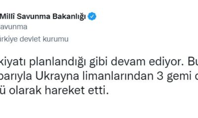 MİLLİ Savunma Bakanlığı (MSB), Ukrayna limanlarından 3 geminin daha tahıl yüklü olarak hareket ettiğini duyurdu. Bakanlığın Twitter’daki hesabından yapılan açıklamada, “Tahıl sevkiyatı planlandığı gibi devam ediyor. Bugün...