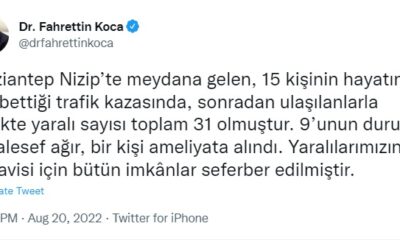 BAKAN KOCA: YARALI SAYISI 31’E YÜKSELDİ Sağlık Bakanı Fahrettin Koca, “Gaziantep Nizip’te meydana gelen, 15 kişinin hayatını kaybettiği trafik kazasında, sonradan ulaşılanlarla birlikte yaralı sayısı toplam...