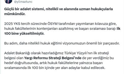 Bakan Tunç, sosyal medya hesabından yaptığı açıklamada, “Güçlü bir adalet sistemi, nitelikli ve alanında uzman hukukçularla mümkündür. 2025 YKS tercih sürecinde ÖSYM tarafından yayımlanan kılavuza göre,...
