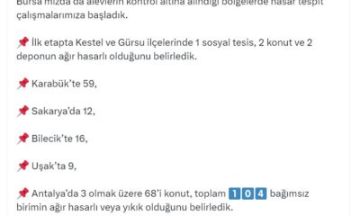 Bakan Kurum: (Yangın bölgelerinde hasar tespiti) İlk etapta Kestel ve Gürsu ilçelerinde 1 sosyal tesis, 2 konut ve 2 deponun ağır hasarlı olduğunu belirledik. Karabük’te 59,...