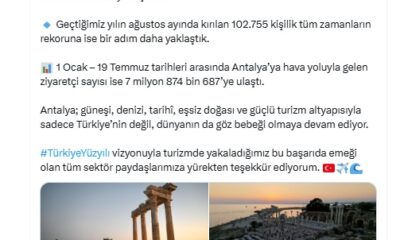 Bakan Ersoy, sosyal medya hesabından Antalyaya gelen yabancı turist sayılarıyla ilgili açıklama yaptı. Bakan Ersoy, 19 Temmuz 2025 tarihinde Antalya ve Gazipaşa havalimanlarından toplam 102 bin...