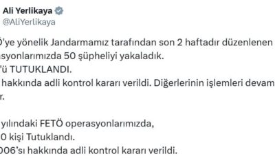 İçişleri Bakanı Yerlikaya: FETÖye yönelik jandarmamız tarafından son 2 haftadır düzenlenen operasyonlarımızda 50 şüpheliyi yakaladık. Şüphelilerden 33ü tutuklandı.