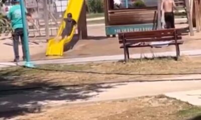 Nilüfer ilçesinde bir parktaki çimleri sulayan belediye temizlik görevlisi, sıcağa rağmen parkta oynayan çocukları görünce, onları serinletmek için elindeki hortumla su sıktı. Hortumla sıkılan suyun altında...