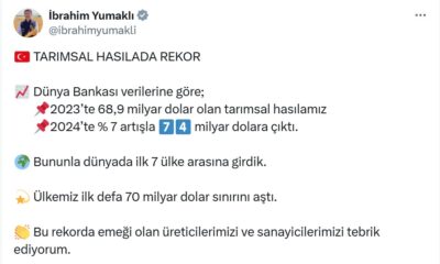 Bakan Yumaklı, sosyal medya hesabından yaptığı açıklamada, “Dünya Bankası verilerine göre; 2023’te 68,9 milyar dolar olan tarımsal hasılamız 2024’te yüzde 7 artışla 74 milyar dolara çıktı....