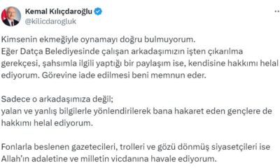 Eski CHP Genel Başkanı Kemal Kılıçdaroğlu, sosyal medya hesabından yaptığı açıklamada, “Kimsenin ekmeğiyle oynamayı doğru bulmuyorum. Eğer Datça Belediyesinde çalışan arkadaşımızın işten çıkarılma gerekçesi, şahsımla ilgili...