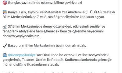 Bakan Kacır, sosyal medya hesabından yaptığı açıklamada, “Gençler, yaz tatilinde rotamızı bilime çeviriyoruz. Kimya, fizik, biyoloji ve matematik yaz akademileri; TÜBİTAK destekli bilim merkezlerimizde 7 ve...