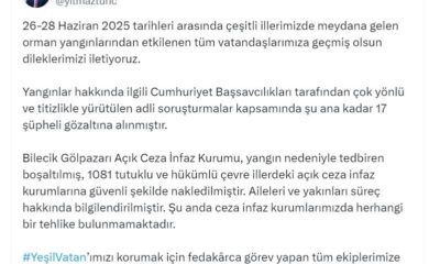 Bakan Tunç, sosyal medya hesabından yaptığı açıklamada, “26-28 Haziran 2025 tarihleri arasında çeşitli illerimizde meydana gelen orman yangınlarından etkilenen tüm vatandaşlarımıza geçmiş olsun dileklerimizi iletiyoruz. Yangınlar...