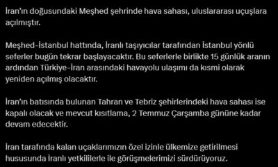 Ulaştırma ve Altyapı Bakanı Abdulkadir Uraloğlu, sosyal medyadan yaptığı açıklamada, “27 Haziran Cuma günü itibariyle; İranın doğusundaki Meşhed şehrinde hava sahası, uluslararası uçuşlara açılmıştır. Meşhed-İstanbul hattında,...