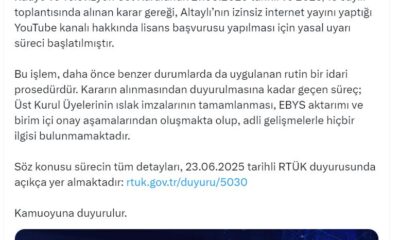 RTÜK Başkanı Şahin, sosyal medya hesabından yaptığı açıklamada, “Kamuoyunda, Fatih Altaylının gözaltına alınmasıyla Üst Kurulumuzun yaptığı tebligat arasında bağ kuran yorumlar üzerine açıklama yapılması gereği doğmuştur....
