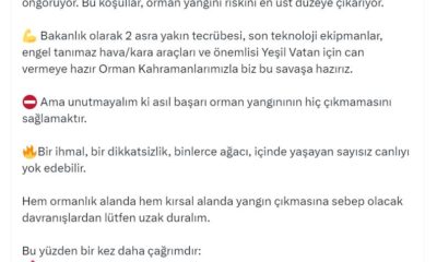 Bakan Yumaklı, sosyal medya hesabından, Yeşil Vatan için şimdi her zamankinden daha dikkatli olma zamanı başlığıyla açıklama yaptı. Yumaklı, “Meteorolojik veriler, önümüzdeki günler için olağanüstü sıcaklık...