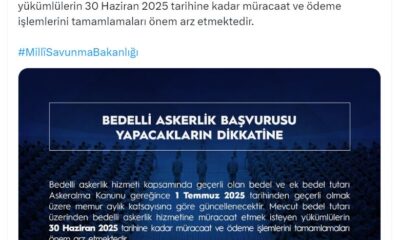 Bakanlığın sosyal medya hesabından yapılan açıklamada, “Bedelli askerlik hizmeti kapsamında geçerli olan bedel ve ek bedel tutarı Askeralma Kanunu gereğince 1 Temmuz 2025 tarihinden geçerli olmak...