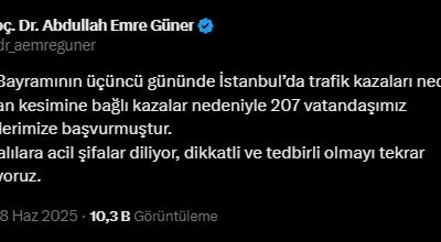 İstanbul İl Sağlık Müdürü Emre Güner, Kurban Bayramının üçüncü gününde kurbanlıklarını kendileri kesmeye çalışan 207 kişinin çeşitli yerlerinden yaralanarak hastanelere başvurduğunu açıkladı. Sosyal medya hesabından açıklama...