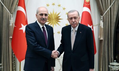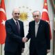 Cumhurbaşkanı Recep Tayyip Erdoğan, TBMM Başkanlığına yeniden seçilen Numan Kurtulmuşu Cumhurbaşkanlığı Külliyesinde kabul etti. Basına kapalı gerçekleşen görüşmeye ilişkin fotoğraf paylaşıldı.