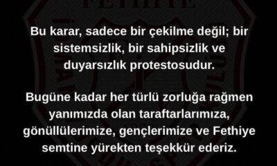 2024-2025 sezonunda Bölgesel Amatör Lig 8’inci Grup’ta şampiyon olarak TFF 3’üncü Lig’e yükselen Bursa temsilcisi Fethiye İdman Yurdu Spor Kulübü, sosyal medya hesabından ligden çekilme kararı...
