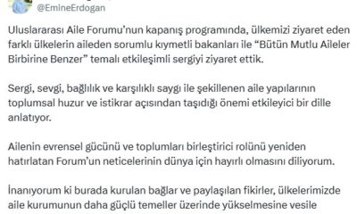 Emine Erdoğan, sosyal medya hesabından yaptığı paylaşımda, Uluslararası Aile Forumunun kapanış programında Türkiyeyi ziyaret eden farklı ülkelerin aileden sorumlu bakanları ile Bütün Mutlu Aileler Birbirine Benzer...