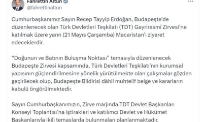İletişim Başkanı Fahrettin Altun, sosyal medya hesabından yaptığı açıklamada, “Cumhurbaşkanımız Sayın Recep Tayyip Erdoğan, Budapeşte’de düzenlenecek olan Türk Devletleri Teşkilatı (TDT) Gayriresmi Zirvesi’ne katılmak üzere yarın...