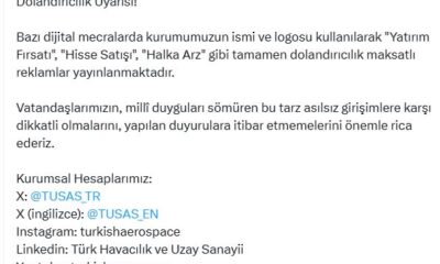 TUSAŞın sosyal medya hesabından yapılan açıklamada, “Dolandırıcılık uyarısı; bazı dijital mecralarda kurumumuzun ismi ve logosu kullanılarak Yatırım fırsatı, Hisse satışı, Halka arz gibi tamamen dolandırıcılık maksatlı...