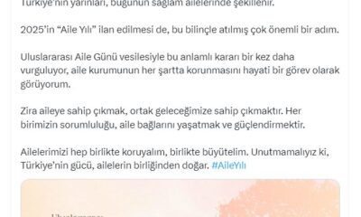 Emine Erdoğan, Uluslararası Aile Günü nedeniyle sosyal medya hesabından mesaj yayımladı. Erdoğan, “Aile, bir milletin en sağlam kalesi; değerlerimizin kaynağı, karakterimizin aynasıdır. Toplumu ayakta tutan sevgi,...