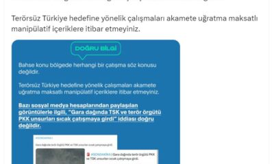 DMMnin sosyal medya hesabından yapılan açıklamada, “Bazı sosyal medya hesaplarından paylaşılan görüntülerle ilgili, Gara dağında TSK ve terör örgütü PKK unsurları sıcak çatışmaya girdi iddiası doğru...