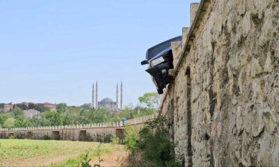 EDİRNEde tarihi Saraçhane Köprüsünün bariyerine çarpan otomobilin asılı kaldığı kazada sürücü T.G., yaralandı. Kaza, akşam saatlerinde, tarihi Saraçhane Köprüsünde meydana geldi. T.G.nin kullandığı 22 AAP O21...